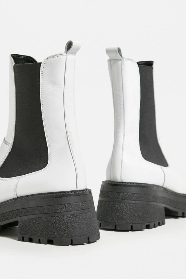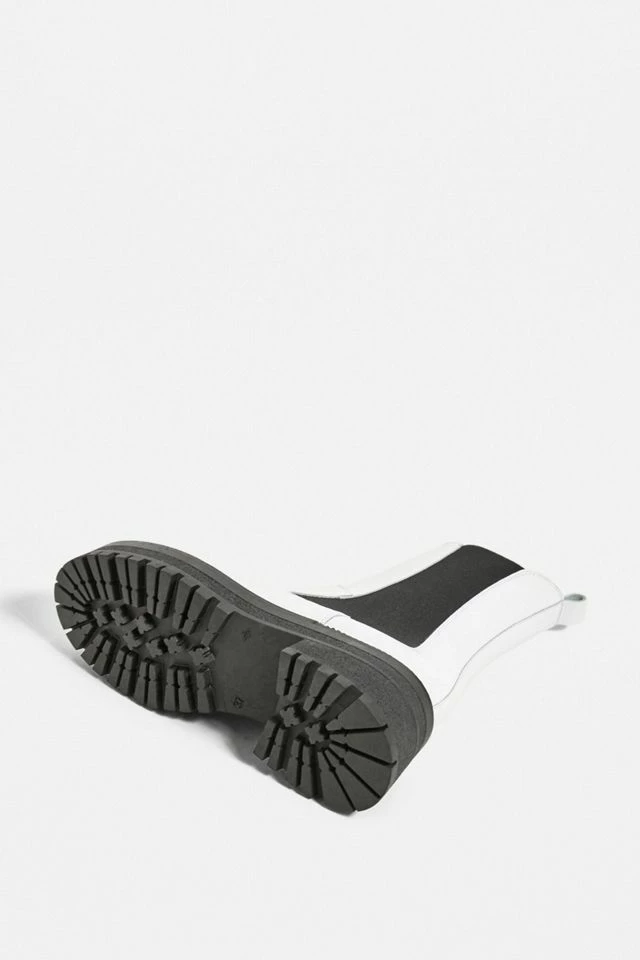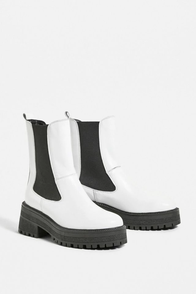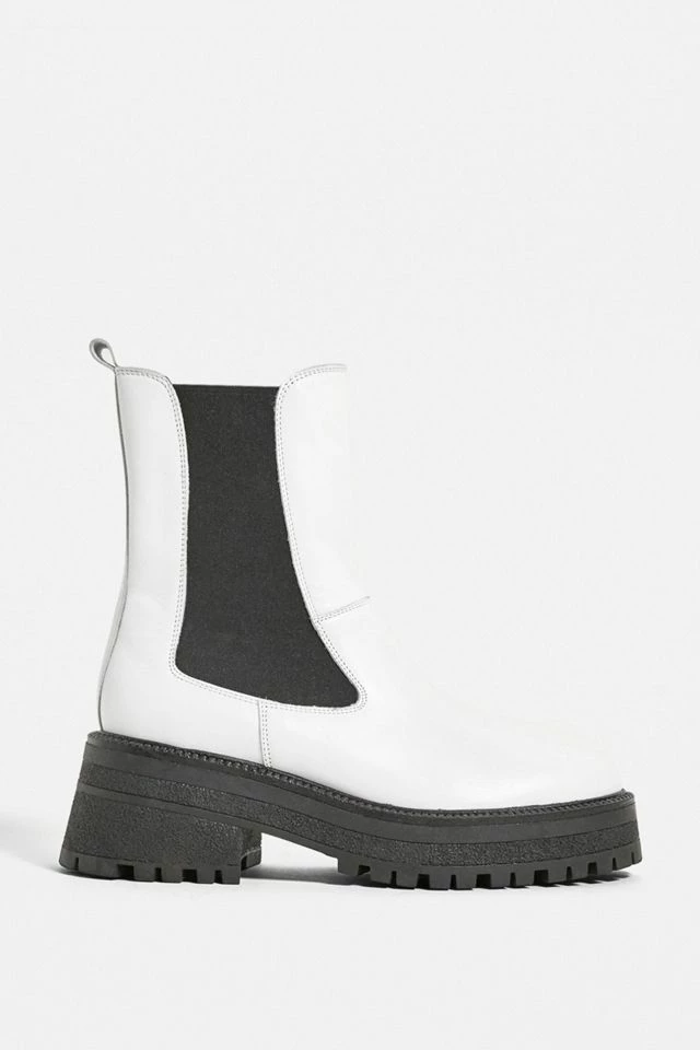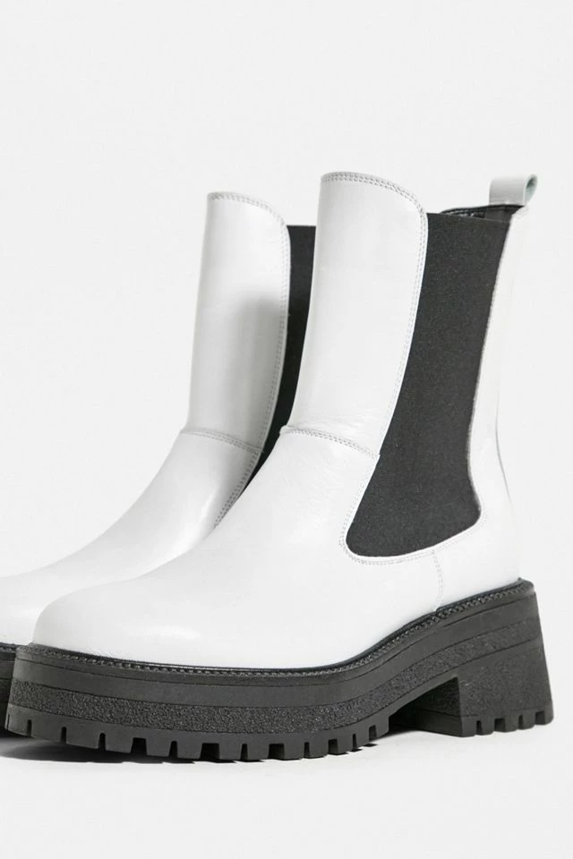 Leather Chelsea boots by Urban Outfitters, for a stand-out look, head to toe. Ankle length boots with heel tabs, decorative side panels and chunky, lugged soles.
