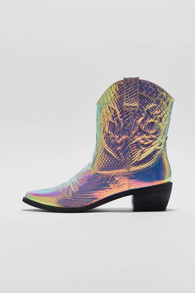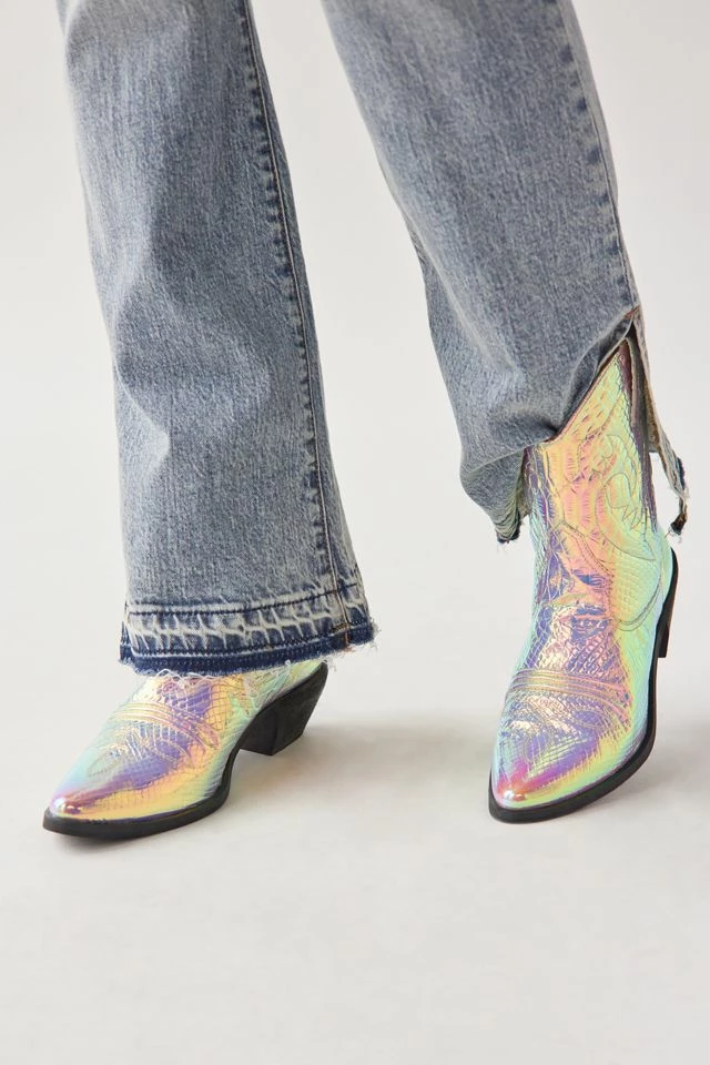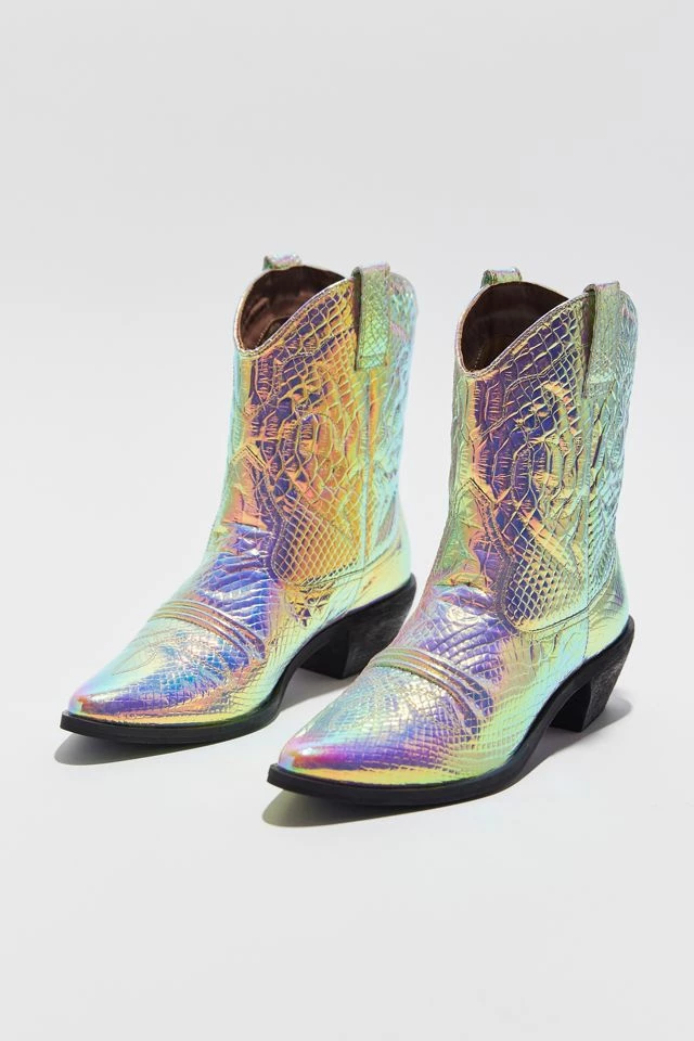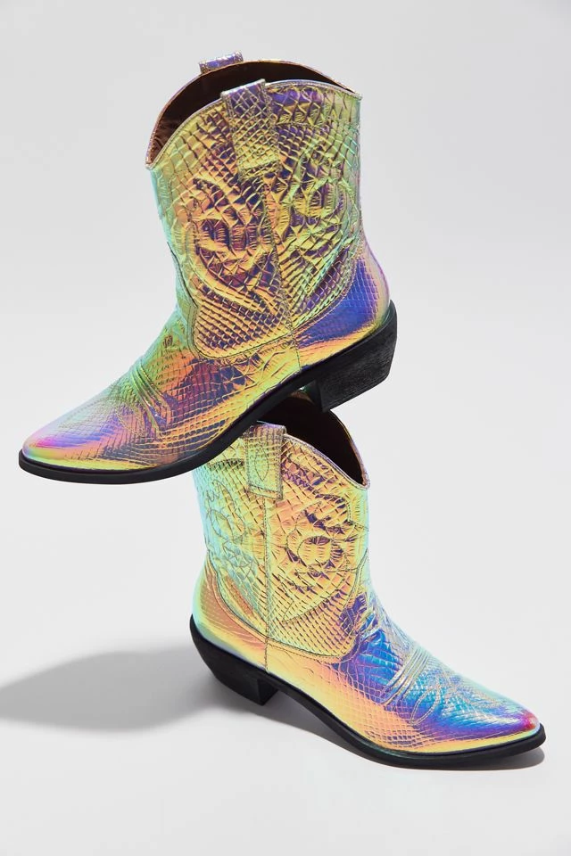Bring the vibes to the desert in these space-cowboy boots by UO designed in iridescent leather and reptile embossing.