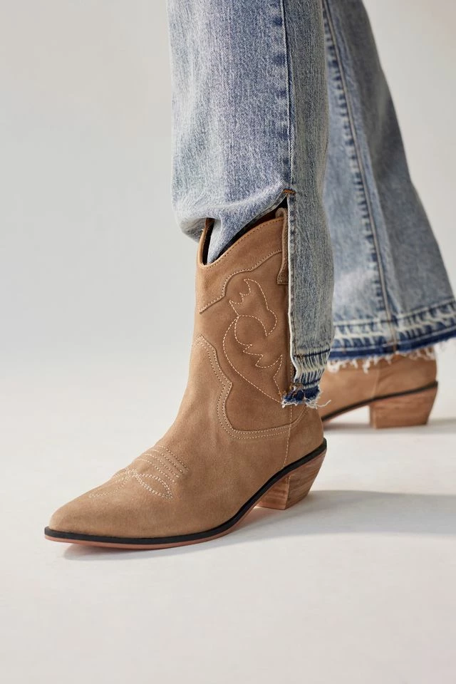 A casual cowboy bootie crafted in suede with standout stitching. Slip-in silhouette with side loops, a short block heel and pointed toe. Exclusively available at Urban Outfitters.