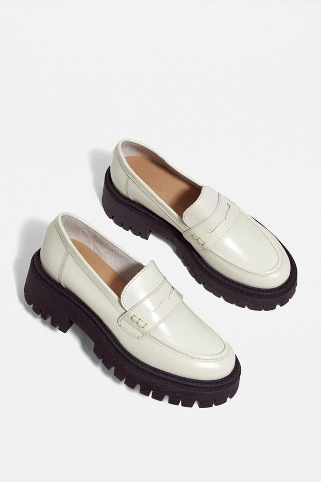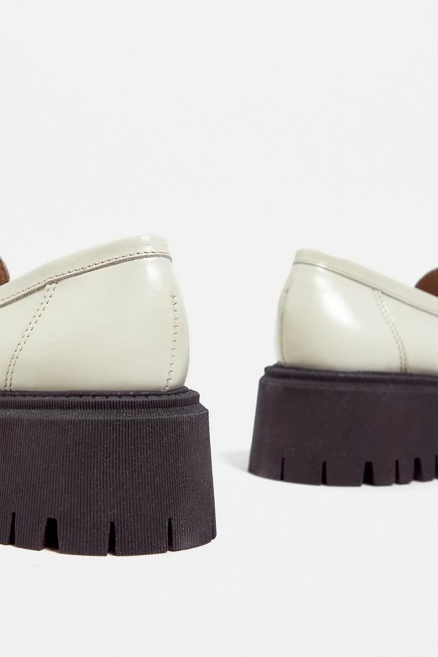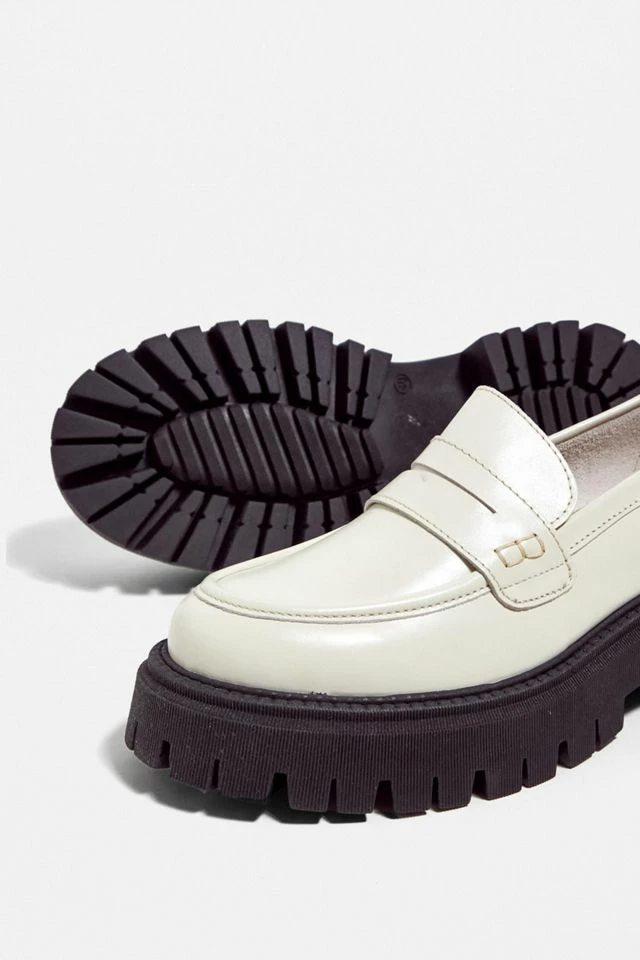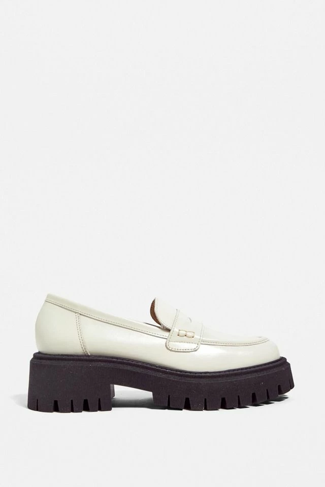 Classic loafers with an updated chunky sole. Features a leather upper set on a solid chunky heeled sole, visible stitching and contoured strap.