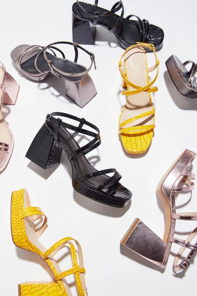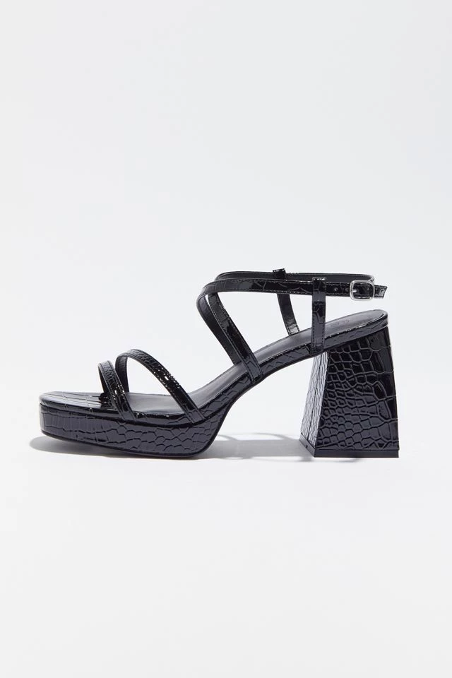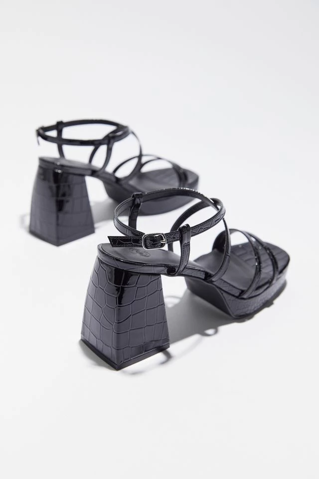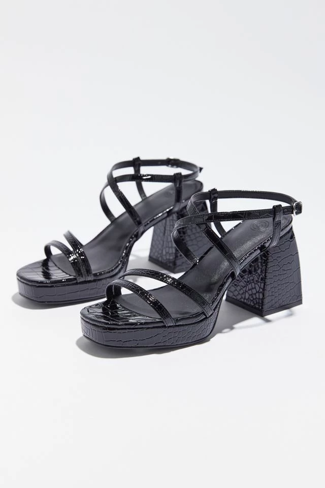 Seriously strappy sandal with a squared toe and flared block heel. Fitted with an ankle buckle closure. Exclusively available at Urban Outfitters.