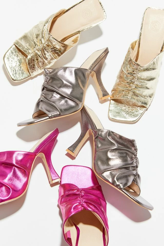 Open-toe mule sandal lifted by a flared heel, squared toe and ruched faux leather upper. Exclusively available at Urban Outfitters.
