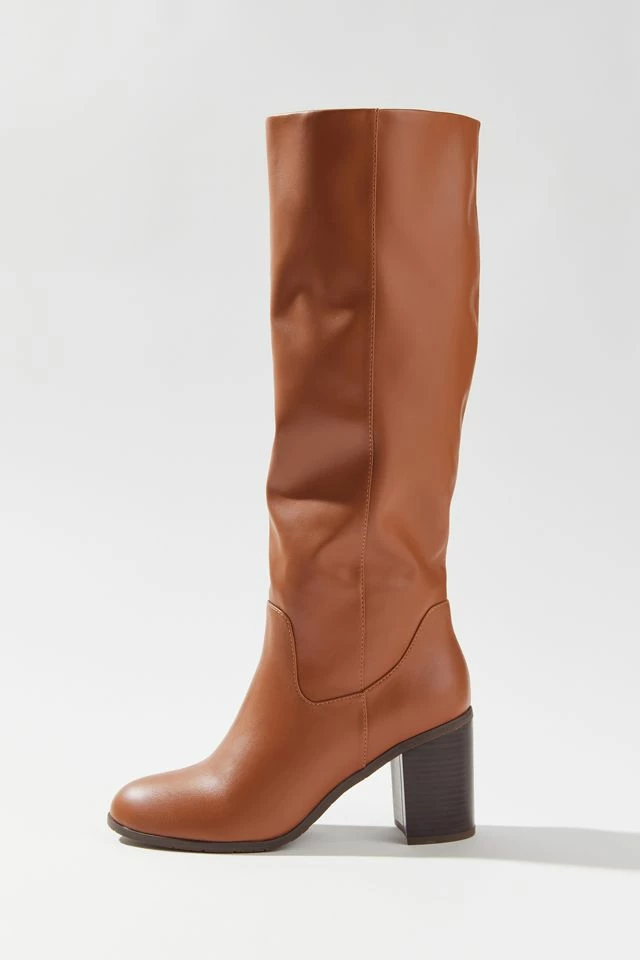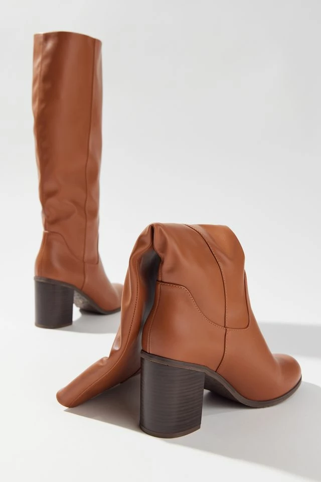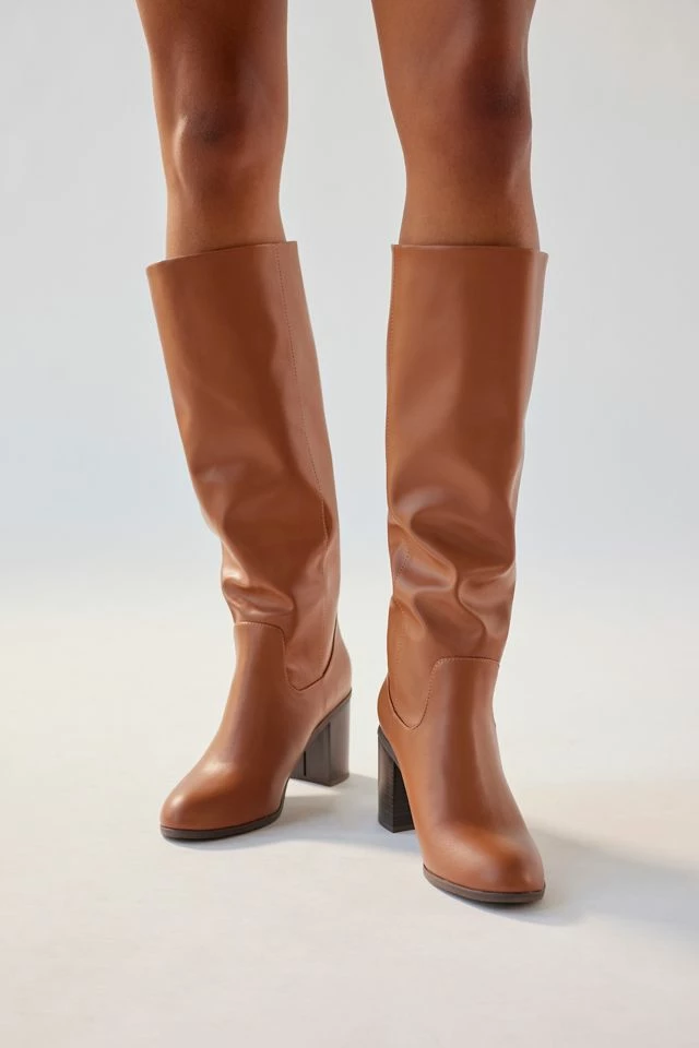 A tall and dreamy vegan leather boot that completes your classic fall style. Featuring a slouchy upper, almond toe and block heel.