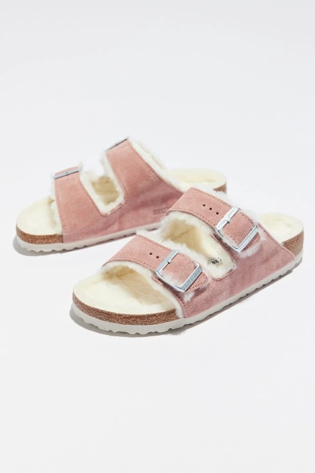 Suede slide sandal from Birkenstock’s popular + classic Arizona model, furbished for winter with extra cozy shearling lining. Two-strap suede upper with adjustable buckles over an anatomically-shaped cork-latex footbed padded with fur. Set on an EVA outsole with signature Birkenstock bone profile.