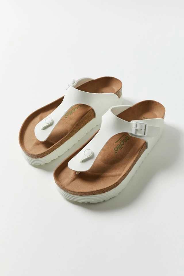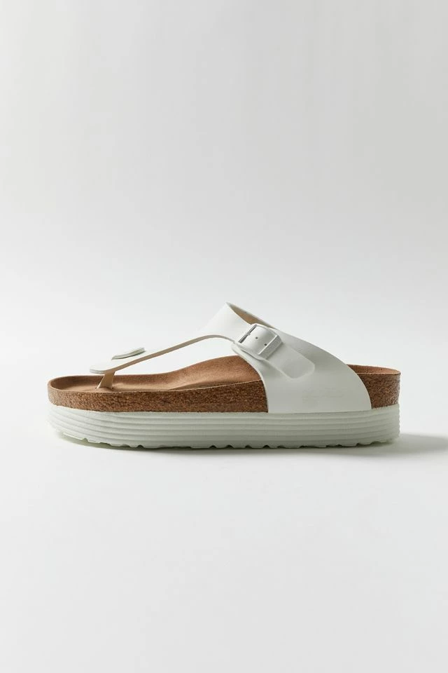 The Birkenstock Gizeh is a genuine classic with its timeless design. Here, Papillio presents the modern thong sandal with a trendy platform sole and vegan materials. The upper is made from the skin-friendly, hard-wearing synthetic material Birko-Flor®, with an anatomically shaped cork-latex footbed lined in microfiber. Beveled EVA outsole with a platform heel provides maximum walking comfort. Made in Portugal.