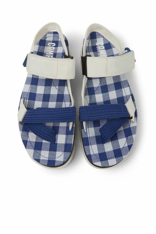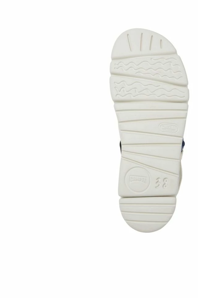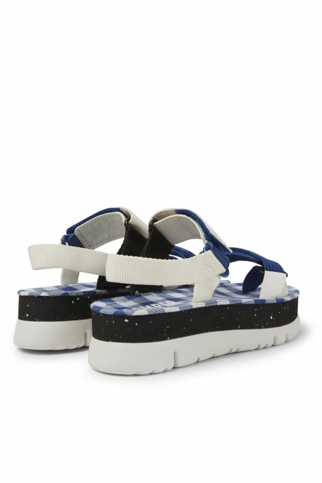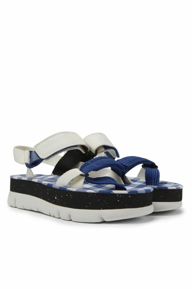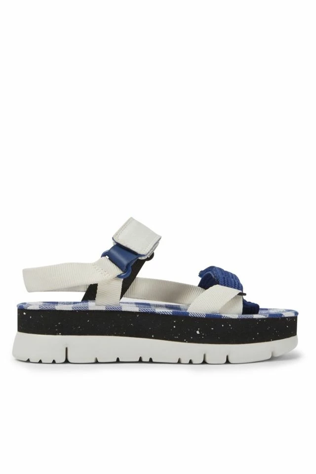 White, blue, and black recycled PET webbing women’s sandals with 100% EVA midsoles (20% recycled), XL EXTRALIGHT® Organix (30% bio-based sugarcane), and a hook-and-loop closing system. Our Oruga Up sandals were designed for summer days and boast a thick characteristic sole for more height and a unique look.