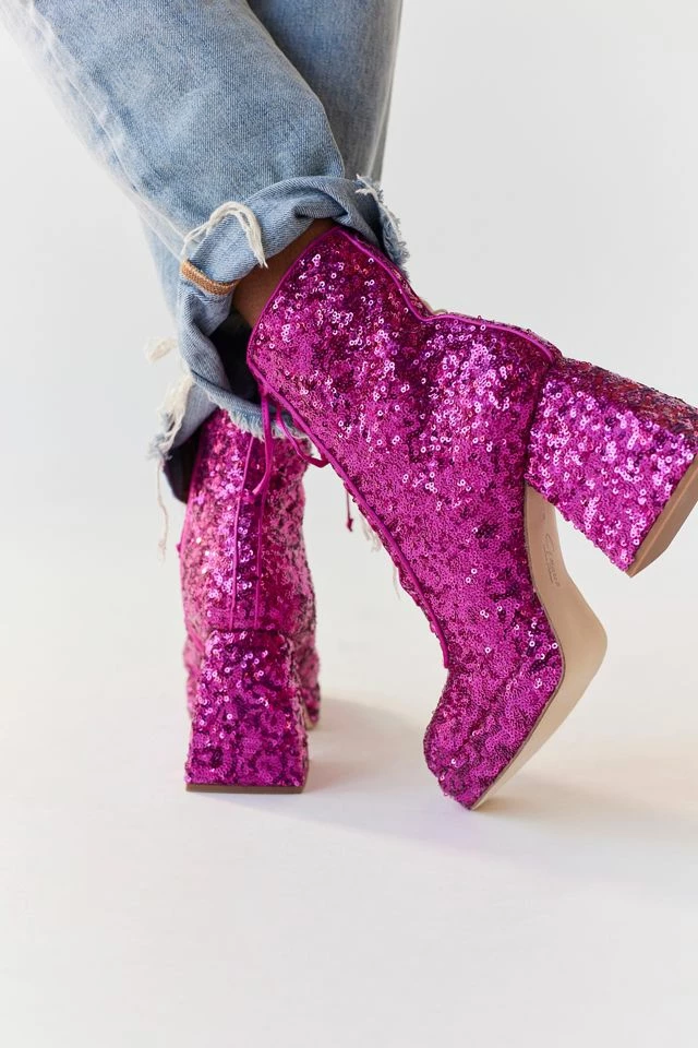 The weapon of destruction from Circus NY. Kia’s deliberate high-shine patent and chunky heel are designed to draw attention. Fitted with a lace-up closure and a side zipper.