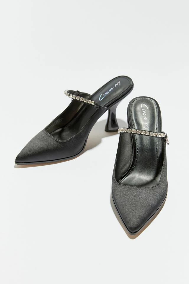 An embellished strap and dainty charm bring luxe elegance to a pointy-toe mule finished with an open back and flared heel.