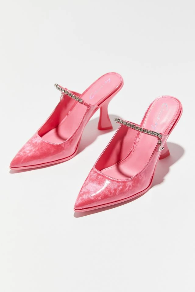 Pointy-toe mules from Circus NY in a bright and shiny coated finish. Open at the top with an embellished strap detail. Open at the back and finished with a flared high heel.