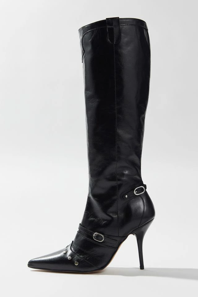 Luxe leather boots from Cooperative. Tall body-skimming silhouette studded along the pointed toe and topped with buckled strap detailing. Inset with a hidden zip closure and finished with a stiletto heel.