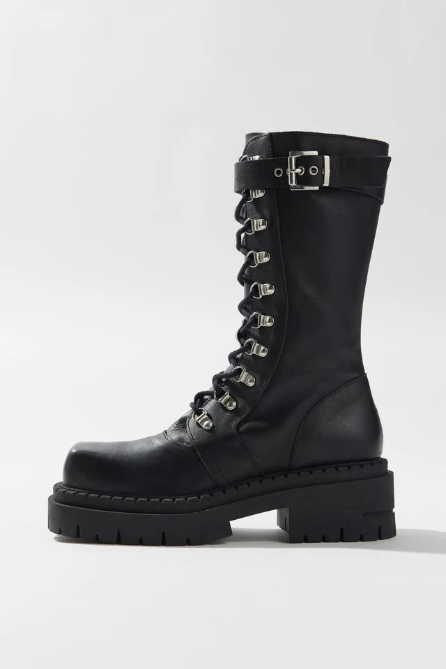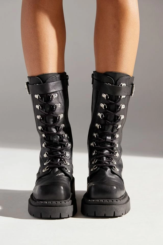Lace-up boots from Cooperative in a modern hiker-meets-combat silhouette. Buckled at the calf with a hidden side zip. Finished with a bumped round toe and chunky lug platform sole. Only at UO.