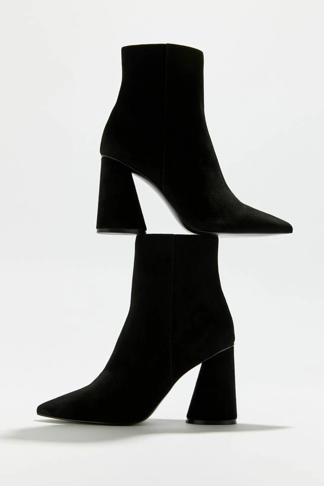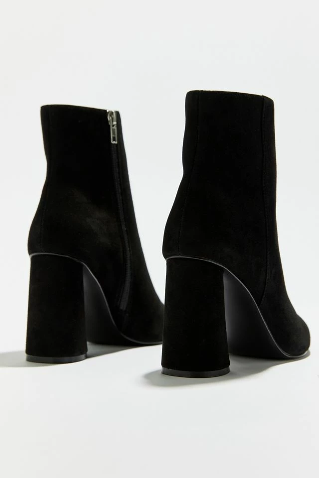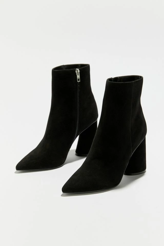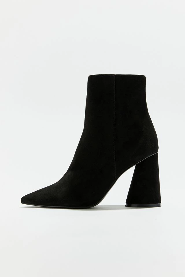 Ankle bootie by Steve Madden with a pointed toe and flared heel covered in soft suede. Includes a zippered shaft for easy entry.