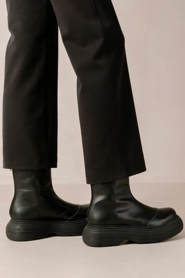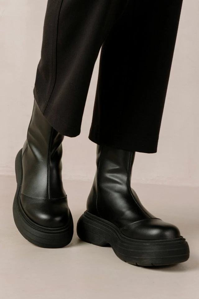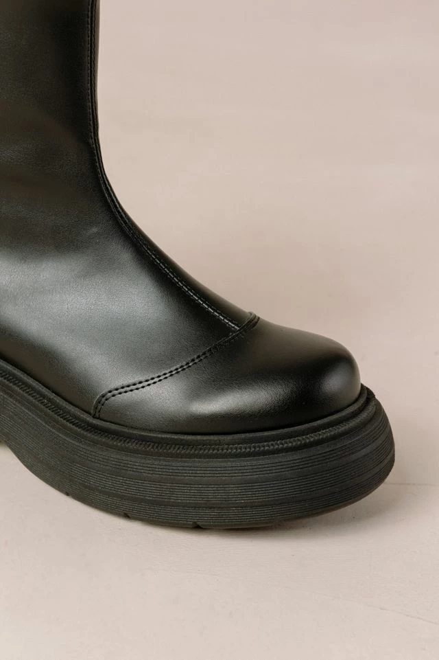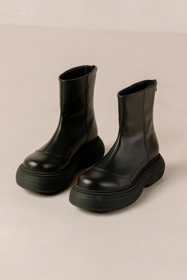 Have you ever seen such a striking pair of boots? Ink is destined to leave a fashion mark. These vegan leather stompers feature a reinforced rounded toe and ultra chunky rubber soles that will have you feel like you are bouncing on the moon. They also have convenient back zips for added comfort and easy wear.