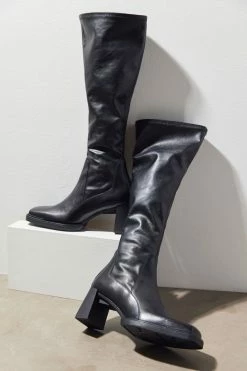 The Edwina boot is a subtle statement piece, featuring a refined silhouette that hits just below the knees. The close-fitting design is made from smooth leather and synthetic leather for a stretchy feel. Details include a squared toe traced with bits of rubber, and a distinct block heel. Knee-high shaft has zipped sides for easy wear and removal.