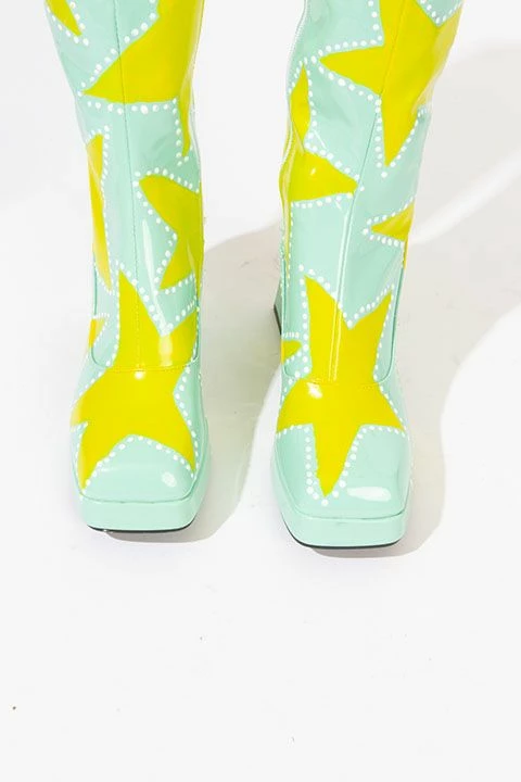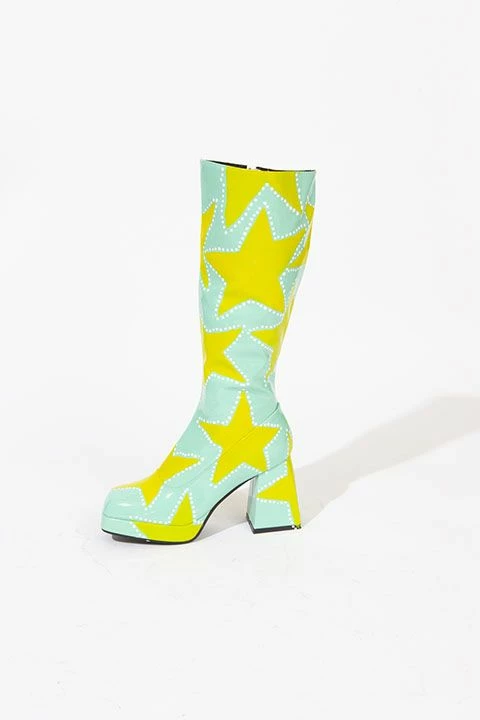 Hand-painted patent leather gogo boots. Painted with professional-grade leather paint and puffy paint for texture. Knee-high height and a square toe. Excellent quality, never been worn.